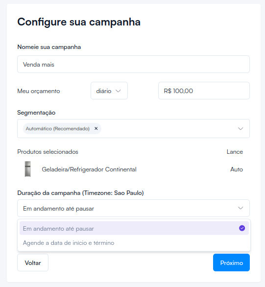 Para duração, temos as opções "Em andamento até pausar" ou "Agende data de início e término"
