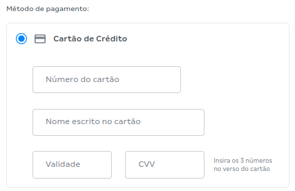 No caso do pagamento via cartão de crédito, basta selecionar a opção desejada e inserir os dados do seu cartão. Veja algumas dicas para o preenchimento correto: