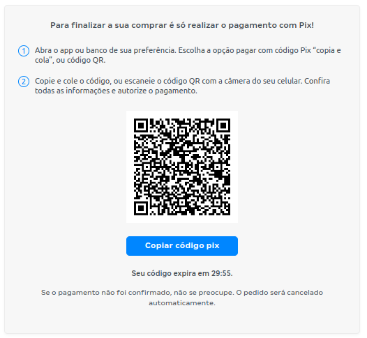 Para pagamento via PIX, basta preencher o nome completo e CPF/CNPJ da conta que realizará o pagamento. Após efetivar a compra, copie o código PIX e faça o pagamento no aplicativo ou banco de sua escolha. O código tem validade de 30 minutos: