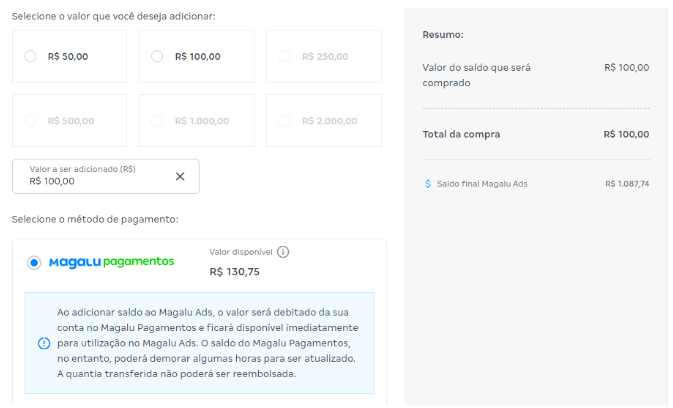- Selecione entre as opções predefinidas o valor que deseja adicionar ou digite o valor desejado. O valor a ser transferido deve partir do montante de recebíveis da conta do parceiro. Esse valor será debitado da sua conta Magalu Pagamentos e transferido ao Magalu Ads Produtos Patrocinados para veiculação das suas futuras campanhas de anúncios. Nessa mesma tela é possível visualizar o saldo disponível no Magalu Pagamentos e, ao lado, a prévia do extrato da transação.